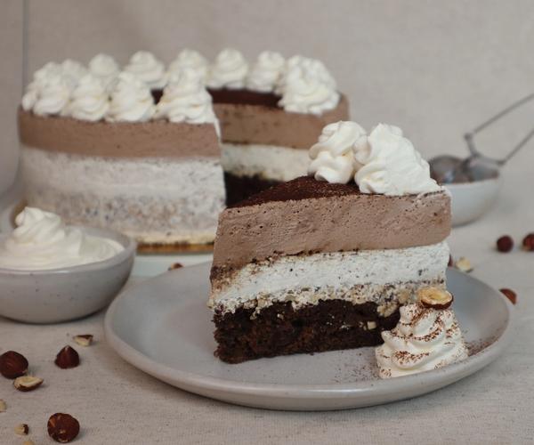 Na čokoládový krém vyšľaháme 250 ml šľahačky, v polovici pridáme karobový prášok a šľaháme do tuha. Zvyšný želatínový rozvar vlejeme do šľahačky a dôkladne premiešame. Zmes nalejte na stuhnutú vrstvu orieškového krému a necháme stuhnúť v chladničke, najlepšie cez noc.